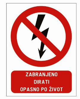 Strojevi i upozorenje moraju na rizičnim mjestima imati vidljivo postavljene znakove sigurnosti o opasnosti od električne struje, a pored zaštitnih naprava ucrtane simbole opasnosti i upozorenje o zabrani skidanja zaštitnih poklopaca. Tekstualni dijelovi uvijek moraju biti na hrvatskom jeziku.